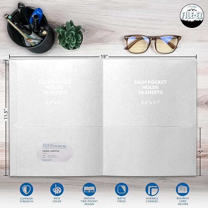- PACKAGE INCLUDES: Your selected PACK SIZE and COLOR of Two-Pocket Folders constructed using Textured Paper, Matte Finish, Supports Letter Sheet Size (8 1/2" x 11")