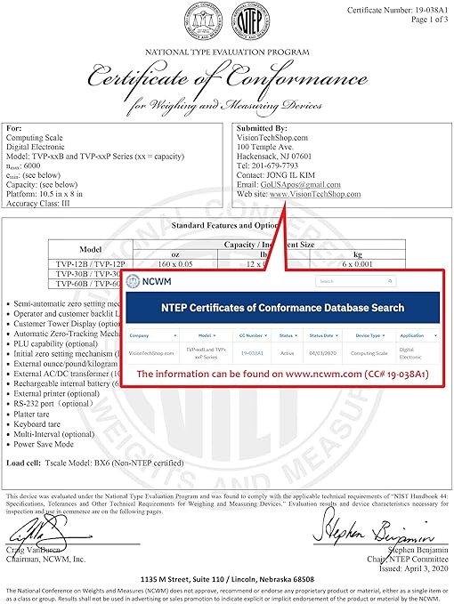 - Lb/Oz/Kg switchable, Easy Operating, NTEP Approved Legal for Trade, Coc #19-038, NSF Certified