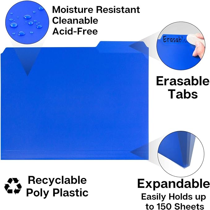 - Durable File Folders: Plastic manila folders 8.5x11, reusable poly file folders letter size. Tear-resistant, cleanable, acid-free. Heavy duty for long term storage.