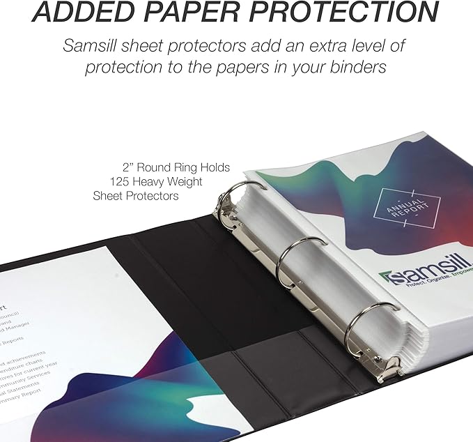 - Heavy-Duty 3-Ring Binders: Built to withstand frequent handling in classrooms, offices, and professional settings, these 2-inch durable binders securely hold up to 425 sheets of standard 8.5" x 11" paper. The robust round-ring design provides smooth page turning with reinforced hinges for long-lasting reliability. Equipped with two clear interior pockets, they’re ideal for keeping important documents, project materials, or office essentials organized and secure