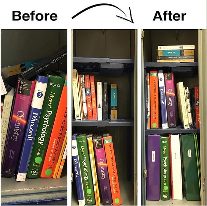 - IDEAL FIT: Adjustable to fit almost all work, school or gym lockers, get your locker organized right away! Adjust width from 8" to 12 1/2", and height from 9 3/4" to 14". Shelf depth is 9 1/2".