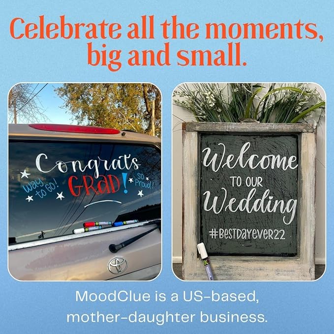- 💥 GREAT FOR HOME / SCHOOL / WORK - Use MoodClue's fun, neon erasable liquid chalk markers on glass, mirrors, car windows, auto windshields, chalkboards, glassboards, whiteboards, bistro boards, most blackboards. These markers are easily erasable and washable from non-porous surfaces. Brighten up your day and make your point.
