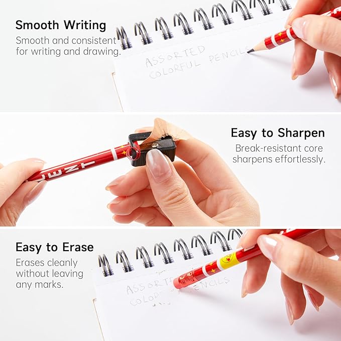 - COLORFUL PATTERNS & ERASERS: We have 12 unique positive patterns, including 6 the most popular cartoon designs and 6 motivation words designs, appealing while encouraging. And each pencil has a soft eraser in the end, which also has different colors