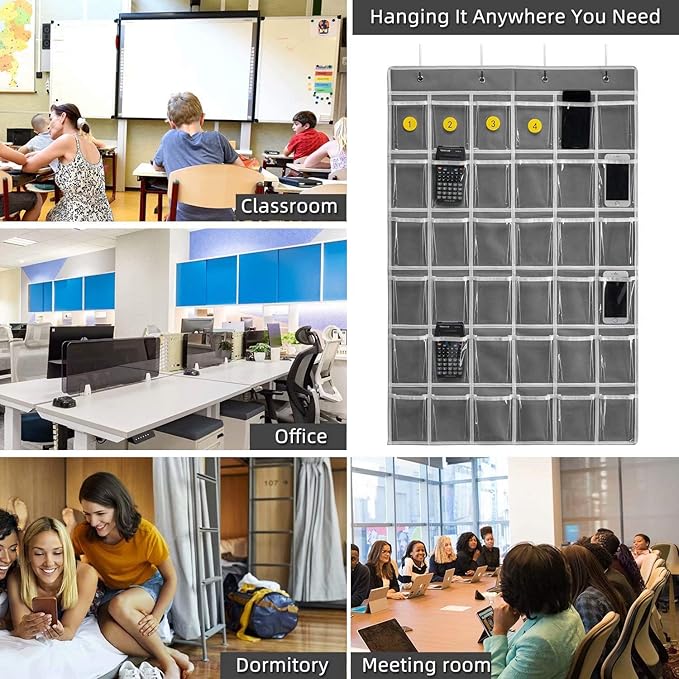 - 🍀【Can be used as a multi-function hanging pocket organizer】This 36 classroom pocket storage doesn’t just hold calculator and cell phones, it can also hold earbuds,stationery,office products, attendance cards, business cards,keys, socks, jewelry and any small things you want to storage. It's also useful for meeting room,office, university, dormitory and home.