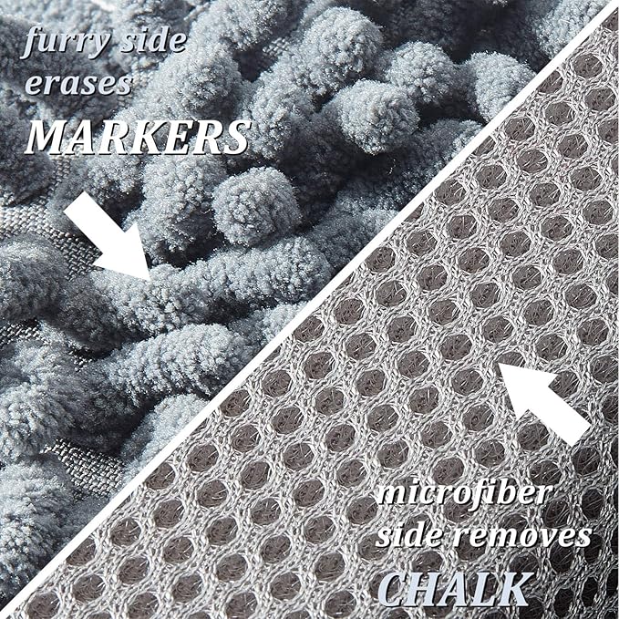- Effective erasing: the microfiber surface of the dry board eraser easily removes most dry erase ink from any dry erase board, while the furry side erases chalk, no liquid cleaners needed; Dual side design is convenient and effective to erase without damaging the writing surface