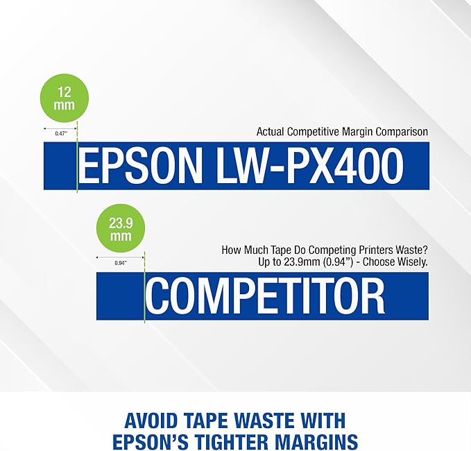 - MAX TAPE WIDTH - The LW-PX400’s powerful labeling capability supports custom and compliant labels up to 1" (24mm) wide. This model is compatible with Epson LABELWORKS PX Tapes such as 212VTBWPX, 212BWPX, 224BWPX, 203YLBWPX, 205STBWPX, and 208B20BWPX for various industrial applications.