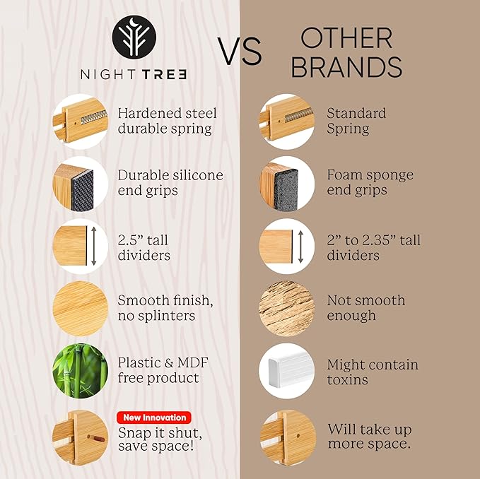 - ULTIMATE ADJUSTABLE DRAWER DIVIDER - NIGHT TREE drawer partitions give you the opportunity for extreme organization. Gone are the days when things got thrown into a drawer with the hope that one would remember and still be able to find whatever it was later. Made of 100% sustainable and incredibly sturdy bamboo, and free of MDF and other toxic materials. These wood drawer dividers / silverware dividers - are the perfect organizational accessory.
