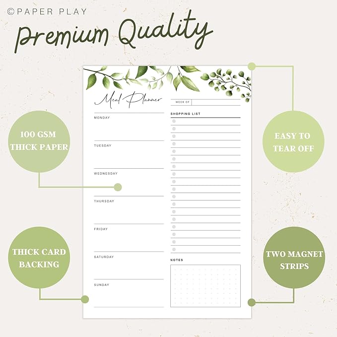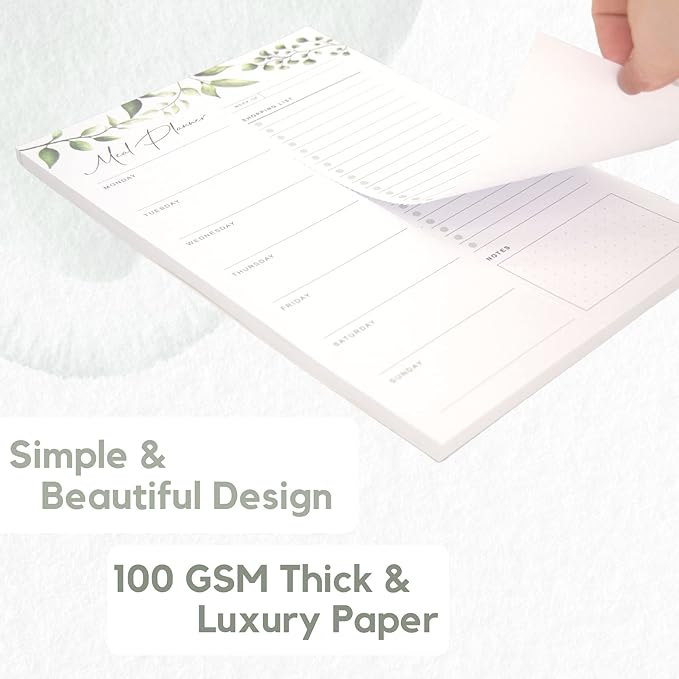 - Premium, Bleed-proof Paper for a Year of Planning: This undated weekly meal planner is made of 100gsm thick paper. It is easy to write on and won’t bleed through. There are 52 tear-off sheets (6 x 9 inch) which are edge-glued and attached to a thick cardboard backing.