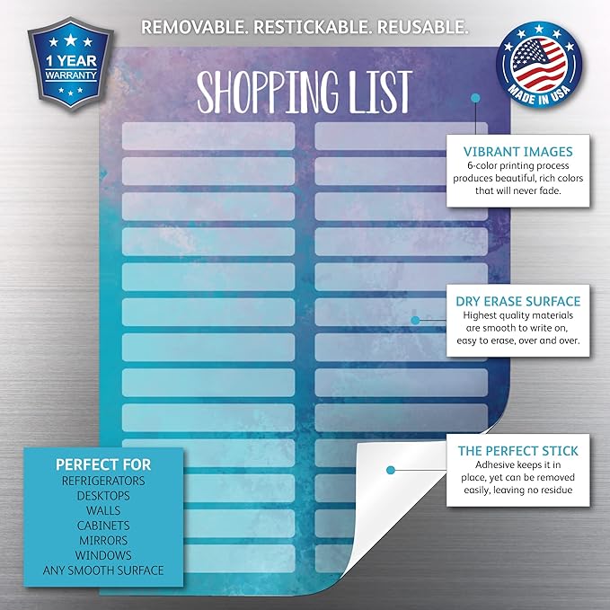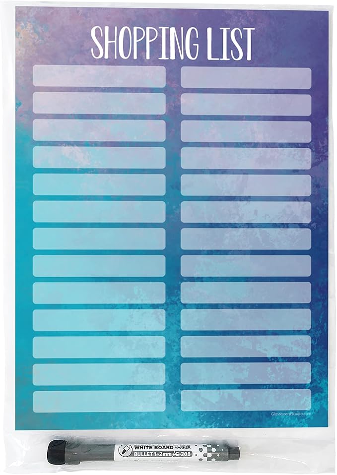 Dry Erase Shopping List Vinyl Sticker Decal Whiteboard by Glassboard Studio | Removable & Reusable | Magnetic Fine-Tip Marker Included (9 x 12 inches, Watercolor)