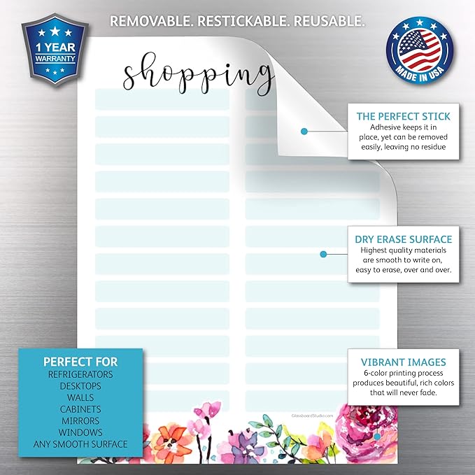 Dry Erase Shopping List Vinyl Sticker Decal Whiteboard by Glassboard Studio | Removable & Reusable | Magnetic Fine-Tip Marker Included (9 x 12 inches, Floral)