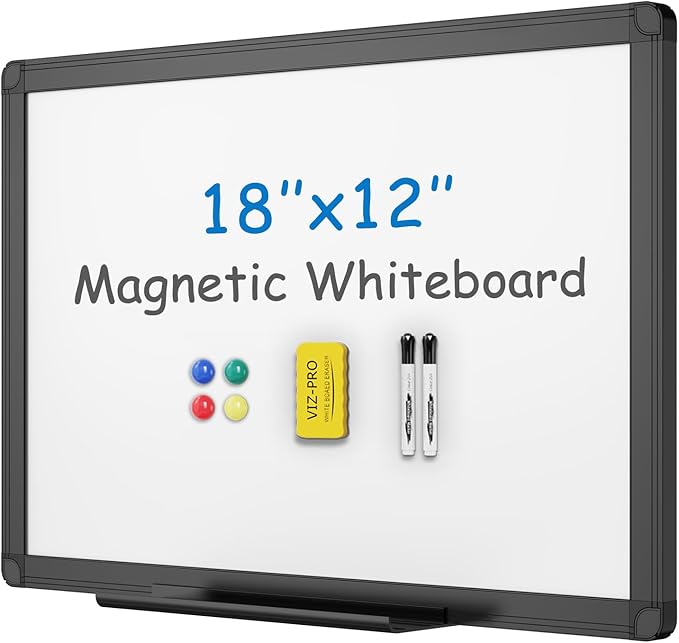 VIZ-PRO Magnetic Whiteboard/Dry Erase Board with Black Aluminium Frame, 18 X 12 Inches, Includes 1 Eraser & 2 Markers & 4 Magnets