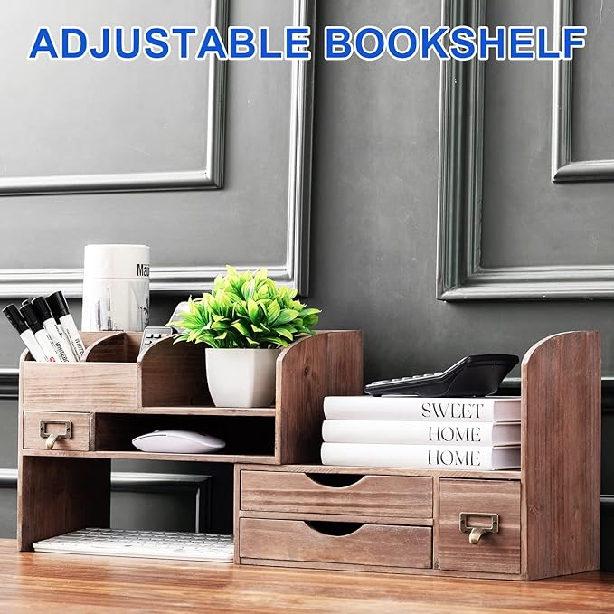Executive Office Solutions Adjustable Wooden Desk Organizer For Desktop, Tabletop, Office or Counter – Wood Storage Shelf Rack For Office Supplies, Desk Accessories, or Mail – Brown