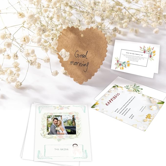 - Elite Design : Both side of these thank you cards have texture ; They are matte, but have a smooth finish ; These are flat cards with no score to be folded ; Securely packaged in a box to ensure you get your heavy card stock in perfect condition and for your convenience to store your invitation paper