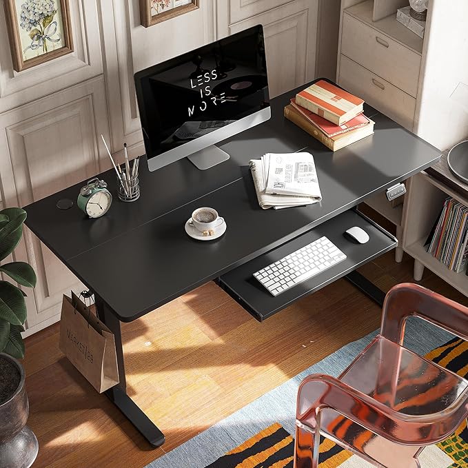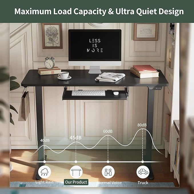- Exclusively Designed Keyboard Tray & Hooks: The stand up desk is configured with a slide-out keyboard tray (23.2'' X 9.8''). Under table hooks (2pcs) are also included. You could enjoy a larger and tidier desktop space