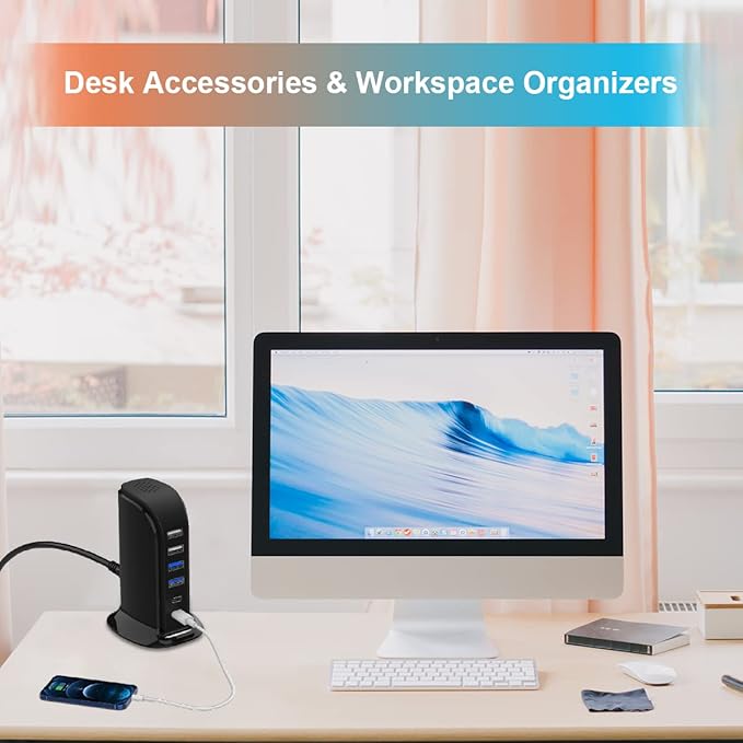 - Desktop cable management: Charging station 6 ports with 5 ft power cord; Compact, Lightweight, Space saving, Portable, Versatile, USB charging hub for 6 devices simultaneously.