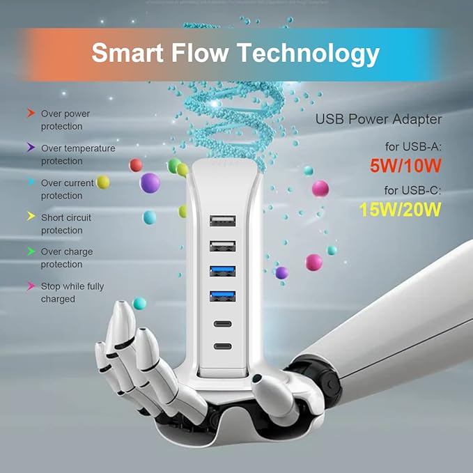 - Desktop cable management: Charging station 6 ports with 5 ft power cord; Compact, Lightweight, Space saving, Portable, Versatile, USB charging hub for 6 devices simultaneously.