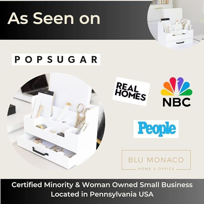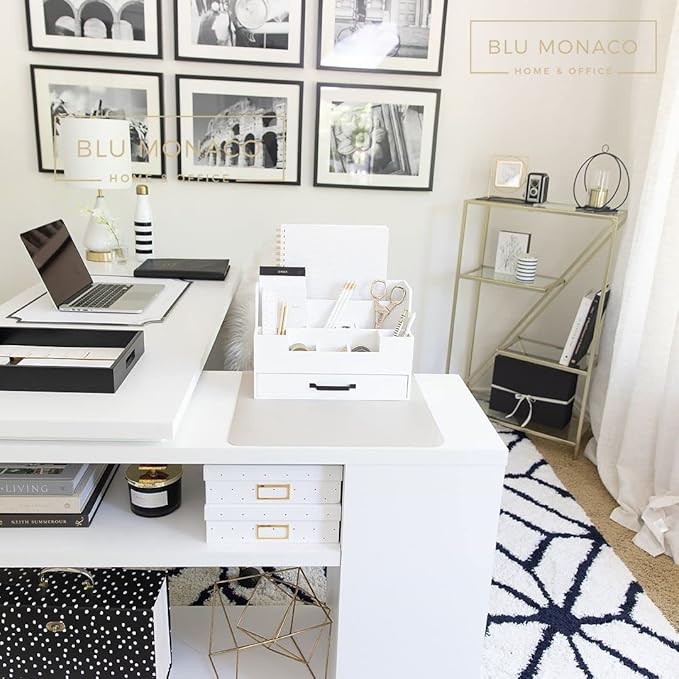 BLU MONACO White Wooden Desk Organizer with Drawer – Office Desk Caddy for Supplies and Accessories – Stylish Desktop Storage for Women