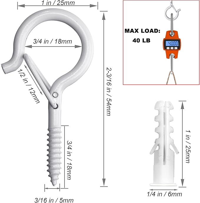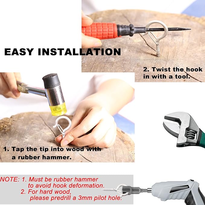- Easy Installation: Drill a pilot hole, insert the drywall anchor if needed and then screw in the hook. Great for eave, patio, deck, ceiling, walls, tree, fence…