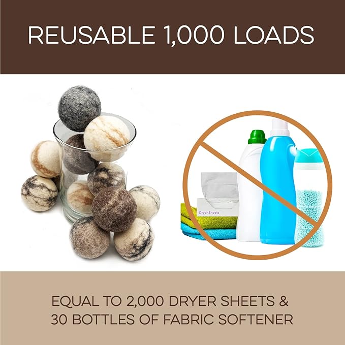 - REUSABLE FOR 1000+ LOADS – REDUCE WASTE: Why keep buying disposable dryer sheets? These cute dryer balls last 1000+ loads, replacing 2000 dryer sheets or 30 bottles of fabric softener. Fluff Ewes dryer wool balls laundry reusable deliver a cost-effective solution for 2-4 years of hassle-free laundry. Make a smarter choice for your wallet and the environment.