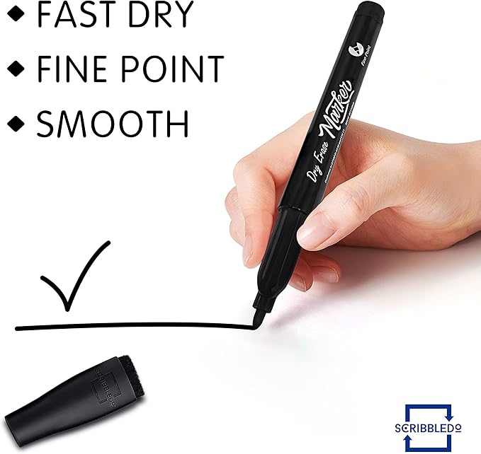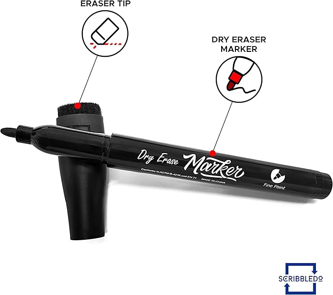 - 🧽 EASY TO ERASE - The extra fine tip dry erase markers with eraser come with an eraser cap, so there is no need for a separate eraser for erasing small mistakes.Using the take note dry erase markers with eraser cap, you can easily wipe off its residue-free washable ink from whiteboards with any cloth or eraser. The black dry erase markers are the number one choice for washable dry erase markers for kids and dry easel erase markers.