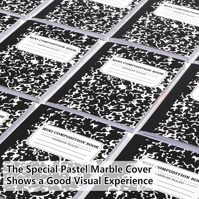 - Feela Mini Composition Notebooks include 70 pack black marble cover pocket size cute composition notebooks.14 duplicates for each color. Each one measures 4.5 x 3.25 inches, which is perfect to carry in pockets and easily held in hand.