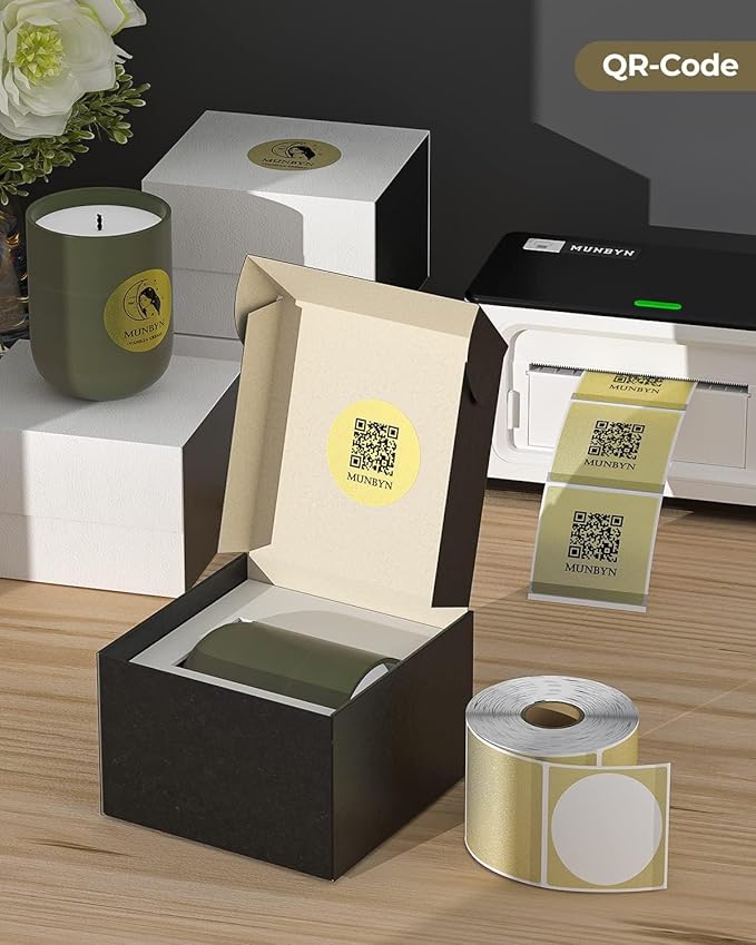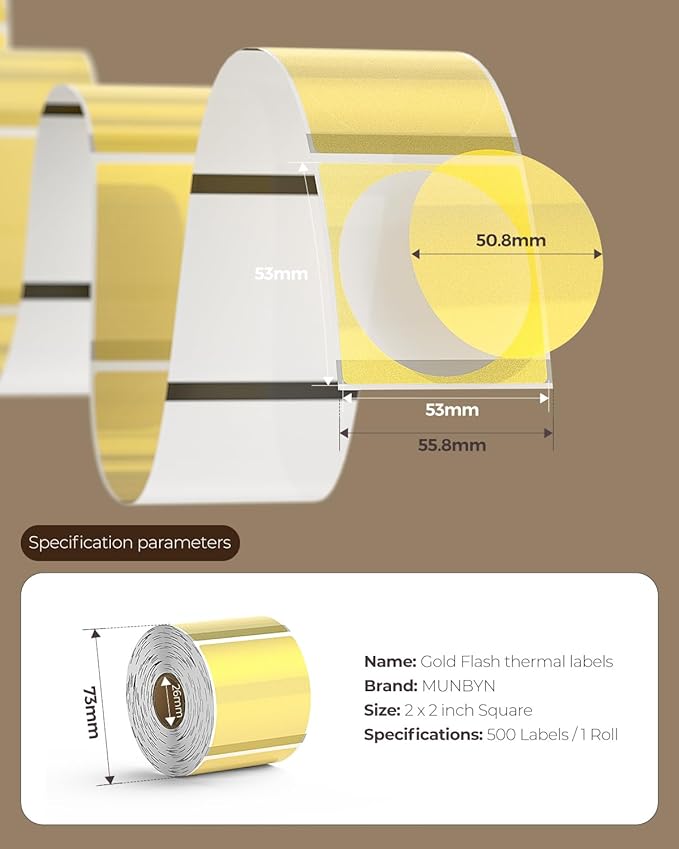 - Munbyn Glitter Series Labels (GT): These gold transparent thermal labels have a printable size of 2 inches (50.8mm x 50.8mm) with a printer setting of 2.09 x 2.09 inches (53mm x 53mm). Each roll contains 500 labels with a paper roll diameter of 2.68 inches (68mm)