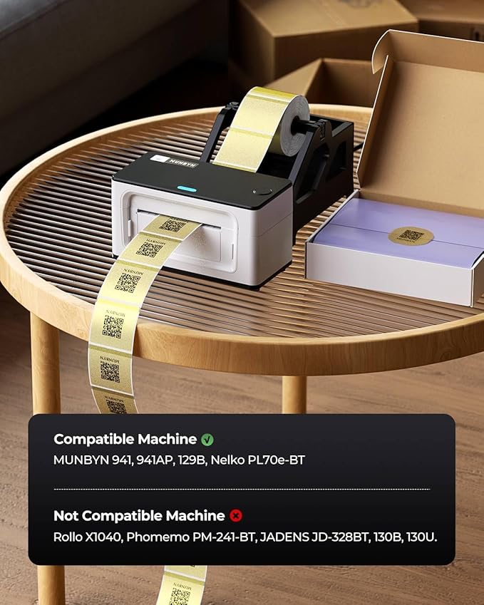 - Compatible with Thermal Printers: These thermal stickers are compatible with Munbyn 941BP, 941U, 129B, 130B, Jadens JD-328BT, Nelko PL70e-BT, and Phomemo printers