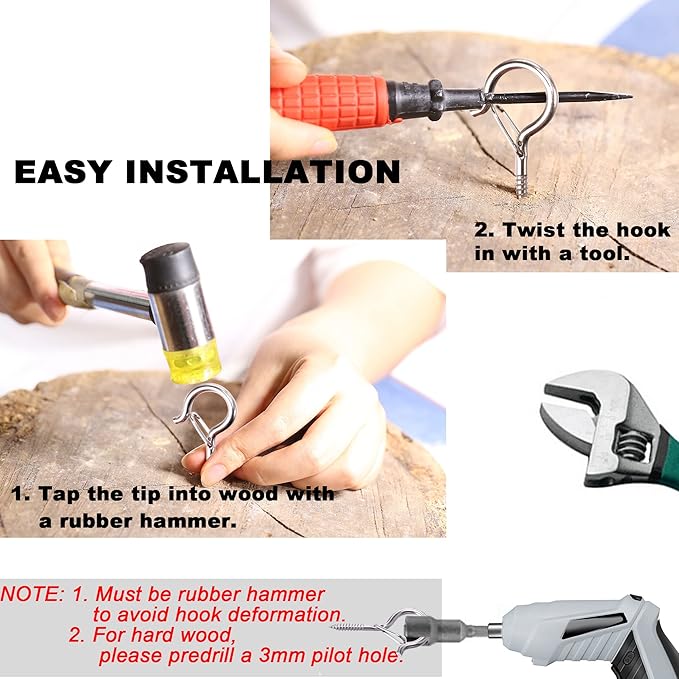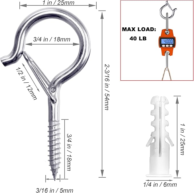 - Easy Installation: Drill a pilot hole, insert the drywall anchor if needed and then screw in the hook. Great for eave, patio, deck, ceiling, walls, tree, fence.