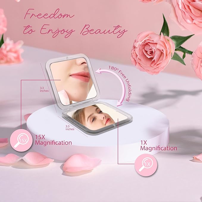 - COMPACT MIRROR - SNOWFLAKES travel mirror with magnification,one side has normal 1x magnification while the other side offers close-up and detailed 15x magnification. Clear and accurate to give you a superior image you can trust. Magnified Makeup Mirror is everything you need for mascara, lipstick, tweezing, plucking, flossing and more. Durable, attractive, convenient and easy to use.