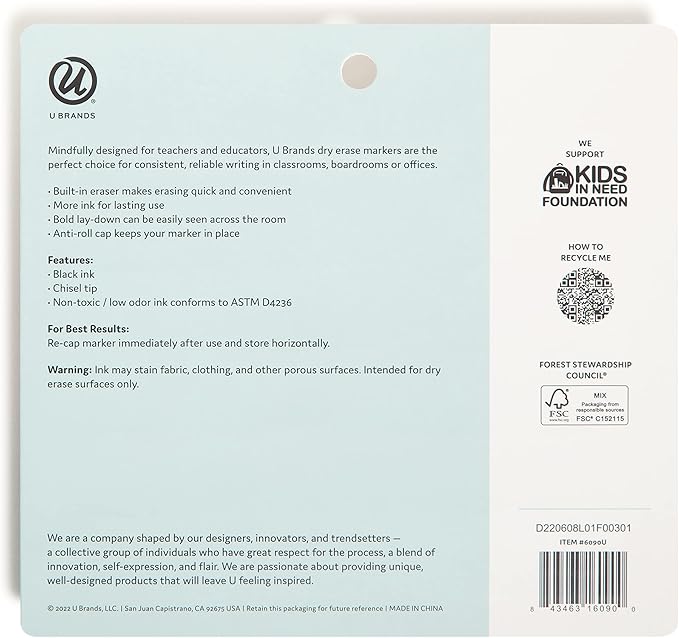U Brands Fine Tip Dry Erase Markers with Eraser, Whiteboard Markers with Chisel tip, Extra Ink, Low Odor, Black, Set of 5