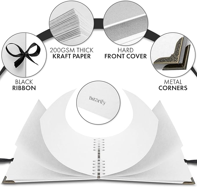 Bstorify Square Scrapbook Photo Albums 36 Pages (18 x 18 cm) White Thick Paper, Hardcover, Metal Corners, Ribbon Closure - Ideal for Your Scrapbooking Albums, Art & Craft Projects 7 x 7 Inch