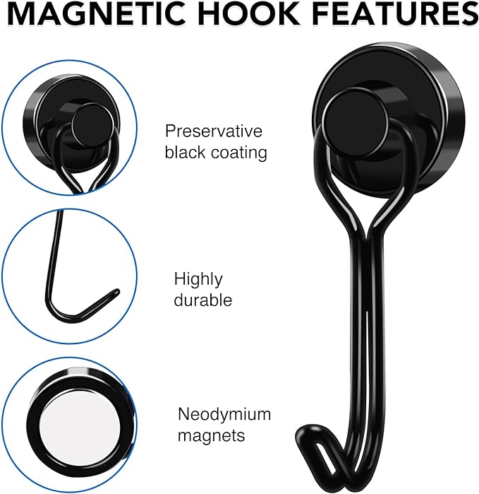 - 【 High-quality Magnetic Coating 】 The magnet hooks adopts a three-layer epoxy resin + nickel + copper coating, providing a lustrous and anti-rust coated steel cup for the magnetic hook, offering protection for the magnetic hook and helping to prevent cracking or breaking.