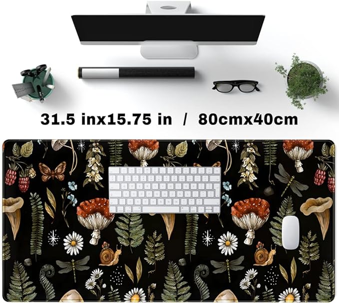 Black Mouse Pad Cottage Core Aesthetic Mouse Pads Mushroom Desk Pad Vintage Mouse Pad Forest Magic Nature Large Desk Pad Ergonomic Mouse Pads with Stitched Edges Non-Slip Computer Mat 31.5x15.7 in