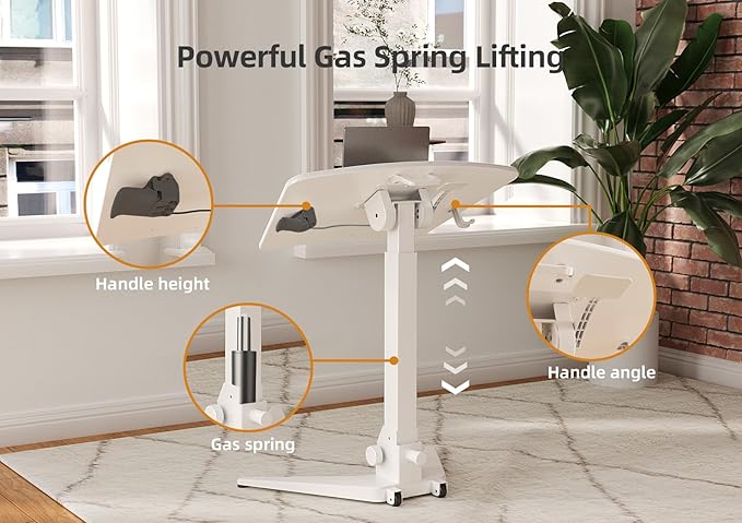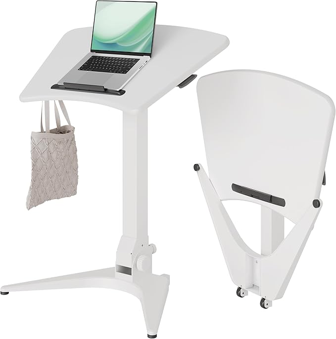 Claiks Mobile Standing Desk, Portable Rolling Workstation With Wheels, Pneumatic Height Adjustable Sit-Stand With 90 Tiltable, Foldable Non-Slip Computer Stand, White