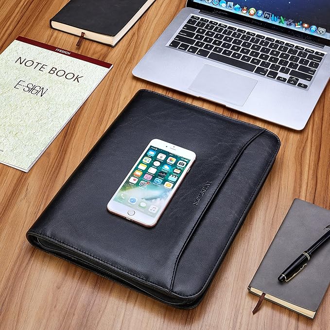- FREE NOTEBOOKS INCLUDED:Enjoy two free 30-page notebooks with this padfolio document organizer. The micro-perforated sheets allow for easy page removal, while the smooth writing paper ensures a pleasant writing experience. The SIM memory card holder design keeps your cards secure and easily accessible, making this padfolio perfect for both left and right-handed users.
