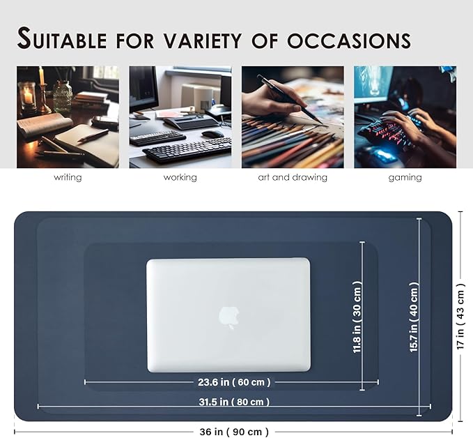 - Versatile Sizes & Comfortable Touch: Choose from Multiple sizes - all with a 1.5mm thickness for comfort. Perfect for different settings, the compact sizes (23.6"x13.8") for small desks, standard options (27.6"x13.8", 31.5"x15.7", 36"x17") for daily office use, and expanded layouts (47.2"x17") for spacious multi-device setups.