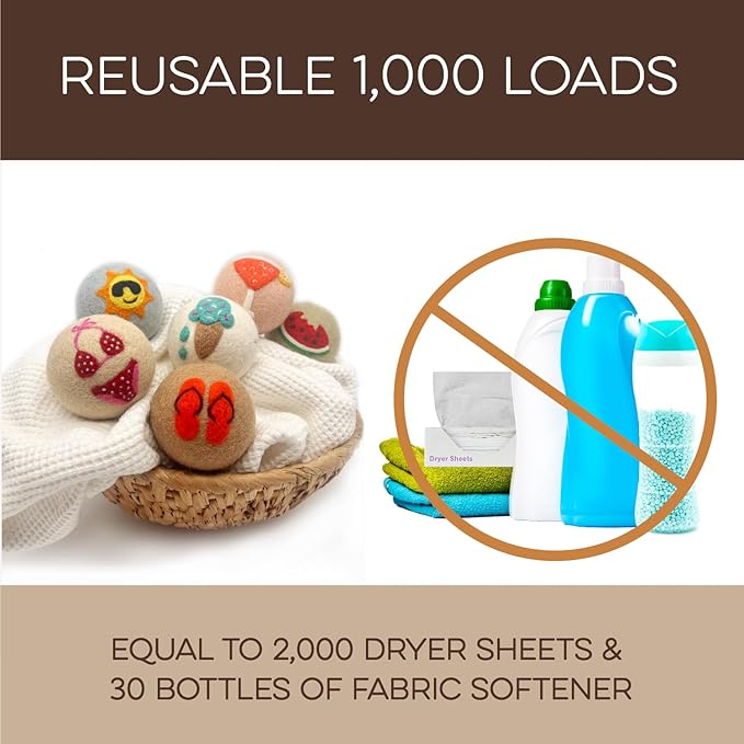- REUSABLE FOR 1000+ LOADS – REDUCE WASTE: Why keep buying disposable dryer sheets? These cute dryer balls last 1000+ loads, replacing 2000 dryer sheets or 30 bottles of fabric softener. Fluff Ewes dryer wool balls laundry reusable deliver a cost-effective solution for 2-4 years of hassle-free laundry. Make a smarter choice for your wallet and the environment.