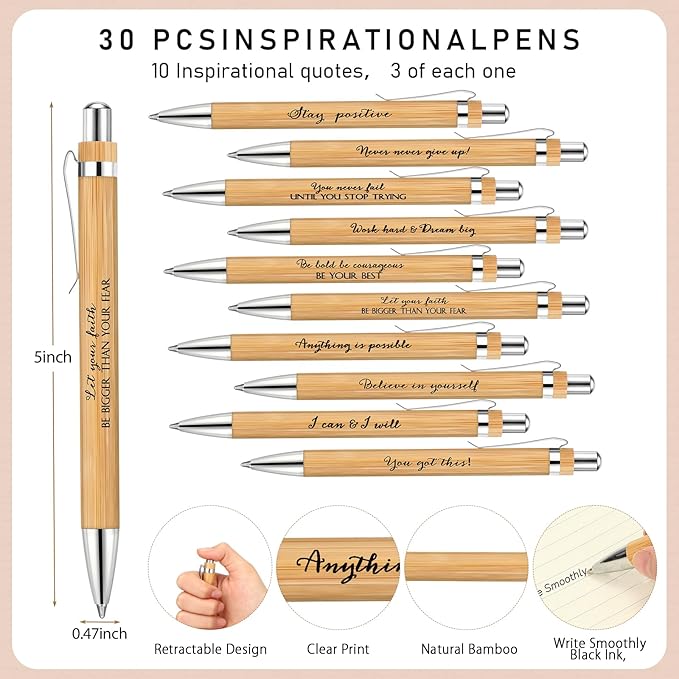 - Appreciation Gifts Bulk: you will receive 30 pcs of motivational spiral notebooks in 10 designs, 3 pcs for each design, each equipped with sticky notes and index tabs, and 30 pcs of retractable bamboo pens in 10 designs, 3 pcs for each design, enough quantity to satisfy your daily use and sharing needs
