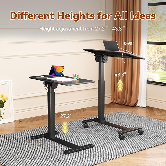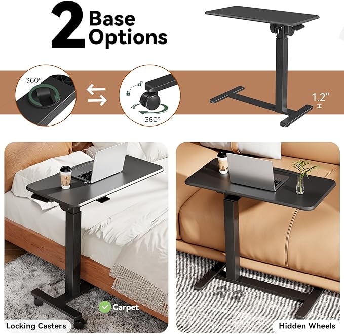 - 2 Types of Casters Included: Our mobile standing desk comes with 4 lockable casters, enhancing maneuverability on carpets. And the low-profile base features hidden wheels that tuck neatly under furniture at a minimum height of just 1.2", maximizing valuable space