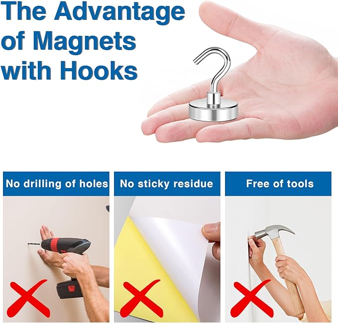 - 【WIDE APPLICATION】Wherever there is iron or steel, the strong neodymium magnets with hooks items you want are easy to install and use without drilling. Our hook magnets are suitable for metal door, locker, garge, refrigerator, grill, tool room, kitchen, and also can be used metal magnetic hooks and magnetic hanger.