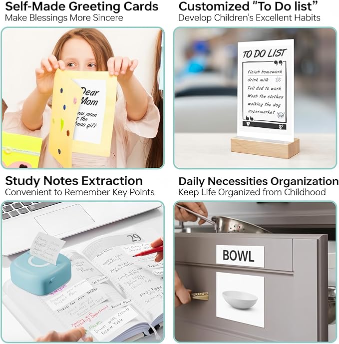 - [Enjoy More Interesting Life] New style inkless pocket printer is used to print pictures/photos,memo,shopping lists,study/meeting notes and etc.Mini sticker printer machine,it's a great helper to decorate your bullet journal more memorable,to make photos more stylish,to organize study notes more efficiently,to keep track of happiness moments at anytime etc.Undoubtedly,it must be a special gift for children,students,teachers and DIY craftsman on Christmas,Children's Day and Thanksgiving day.