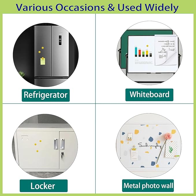 - 【Super strong magnet】These colorful magnets are made of very strong magnetic material, which ensures strong adhesion and a long service life. The round magnets has a larger magnetic contact area, holds better and more durable than other magnets. Colored cases and magnets are tightly bonded with adhesive, so you don't have to worry about the colored case and adhesive peeling off. Thanks to the button shape, it can be easily removed by hand.