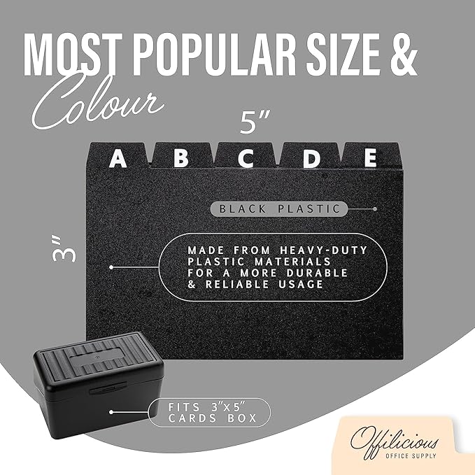 - ORGANIZE & CATEGORIZE your 4x6 index cards with precision using our OFFILICIOUS 4x6 Index Card Holder Dividers. Our dividers feature 25 Plastic Black Index Card Dividers with ALPHABET TABS, ensuring seamless access to your colored index cards 4x6 and creating a streamlined index card organizer for enhanced efficiency.