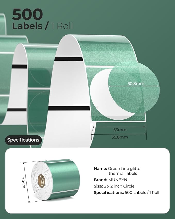 MUNBYN 2 Inch (50.8x50.8mm) Green Transparent Thermal Labels, Round Fine Glitter Printable Thermal Stickers for Small Businesses, 500 Labels/1 Roll