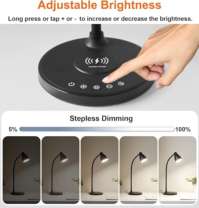 - Dual Charging Hub + Wireless Power for Home Office: Upgrade your workspace with BOHON's multifunctional desk light featuring dual USB-A/USB-C ports (5V/2A) and a 12W fast wireless charger. Effortlessly power phones, tablets, or e-readers while working - whether using this bedside lamp as a nighttime charging station or a home office desk lamp. Pro Tip: Thick phone cases may interfere with wireless charging.