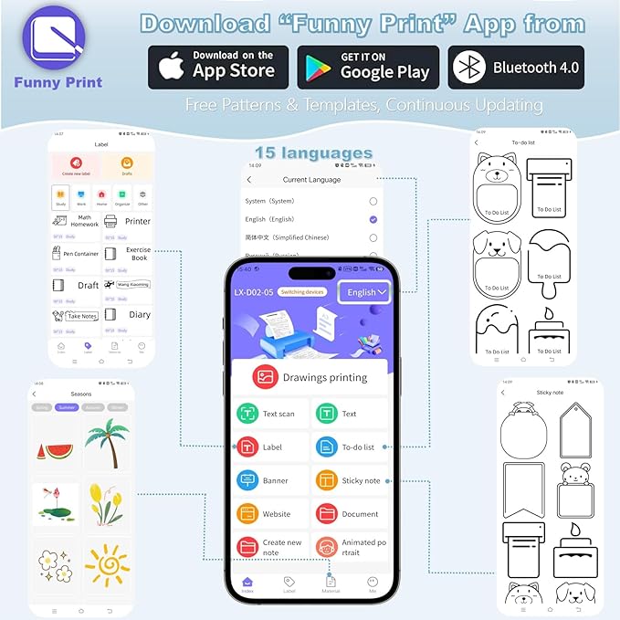 - [Easy Set Up Inkless Printer]→Search and download "Funny Print" App on App Store or Google Player——Long press the printer switch, the green light flashes——Turn on the Bluetooth device of the mobile phone(compatible with IOS & Android) /tablet——open the "Funny Print" App and click "Connect" to connected the closest "LX-D2" device to you——Print instantly