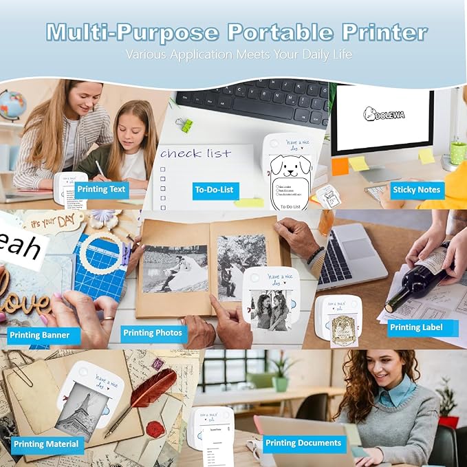 - [Multifunctional Thermal Printer]→This mini pocket printer is versatile, allowing you to print black and white photos/pictures, ideal for printing sticker, memos, shopping lists, study notes, meeting notes, handwork teaching, business and work plans, office aids, labels, messages, lists, web pages, QR codes and records. Suitable for various scenarios such as office, home, students, children, travel, can meets all your needs of your daily life and work