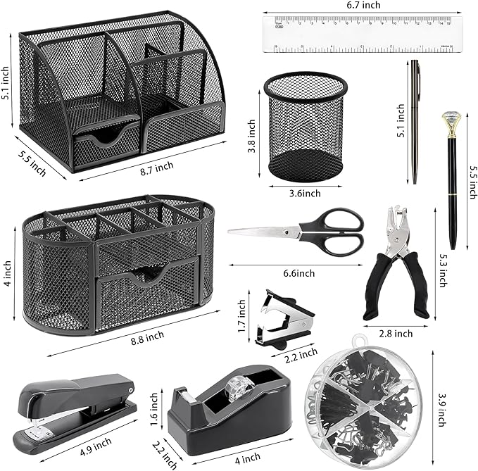 17 in 1 Black Desk Organizers and Accessories Set, 3 Office Desk Supplies Storage Organization, 4 Pens, Stapler, Staples & Remover, Tape & Dispenser, Scissors, Ruler, Clips, Hole Punch, Back to School