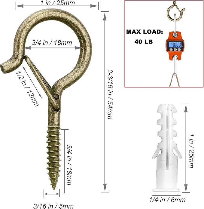 - Easy Installation: Drill a pilot hole, insert the drywall anchor if needed and then screw in the hook. Great for eave, patio, deck, ceiling, walls, tree, fence…