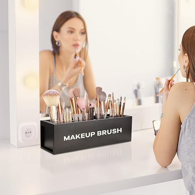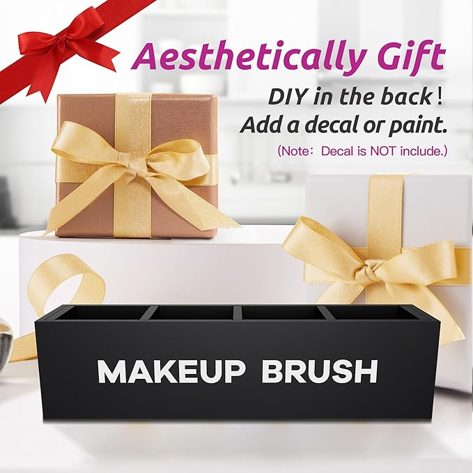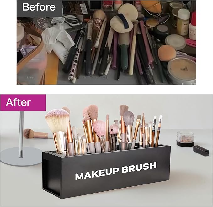 - 【Upgrade DividerI Design】 Our wooden makeup brush organizer has 4 compartments. Large, roomy and pretty. Easy to grab brushes. Size:13.8"L x 3.4"W x 3.5"H. You can store all of your makeup tools easily and neatly. The rectangular shape can fit in nicely against the wall. A nice vanity desktop decoration!